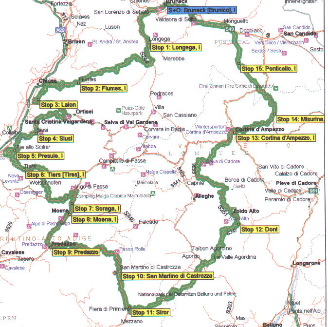 Bruneck - Sorafurcia - Colfosco - Grödner-Joch - Sella - Canazei - Vigo di Fassa - Latemar